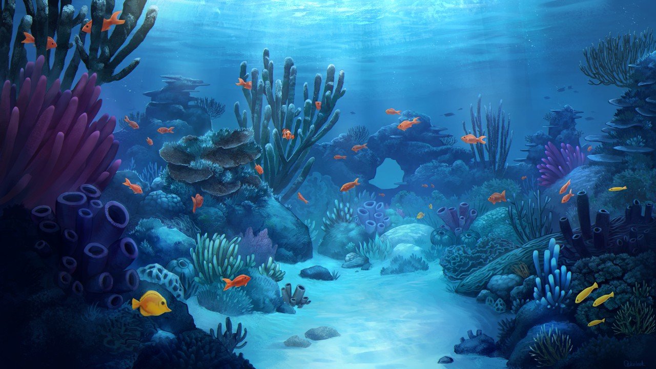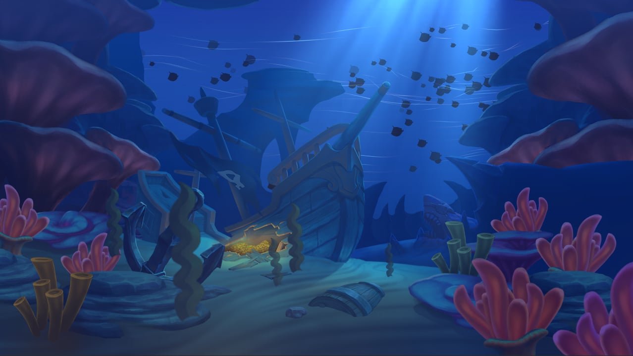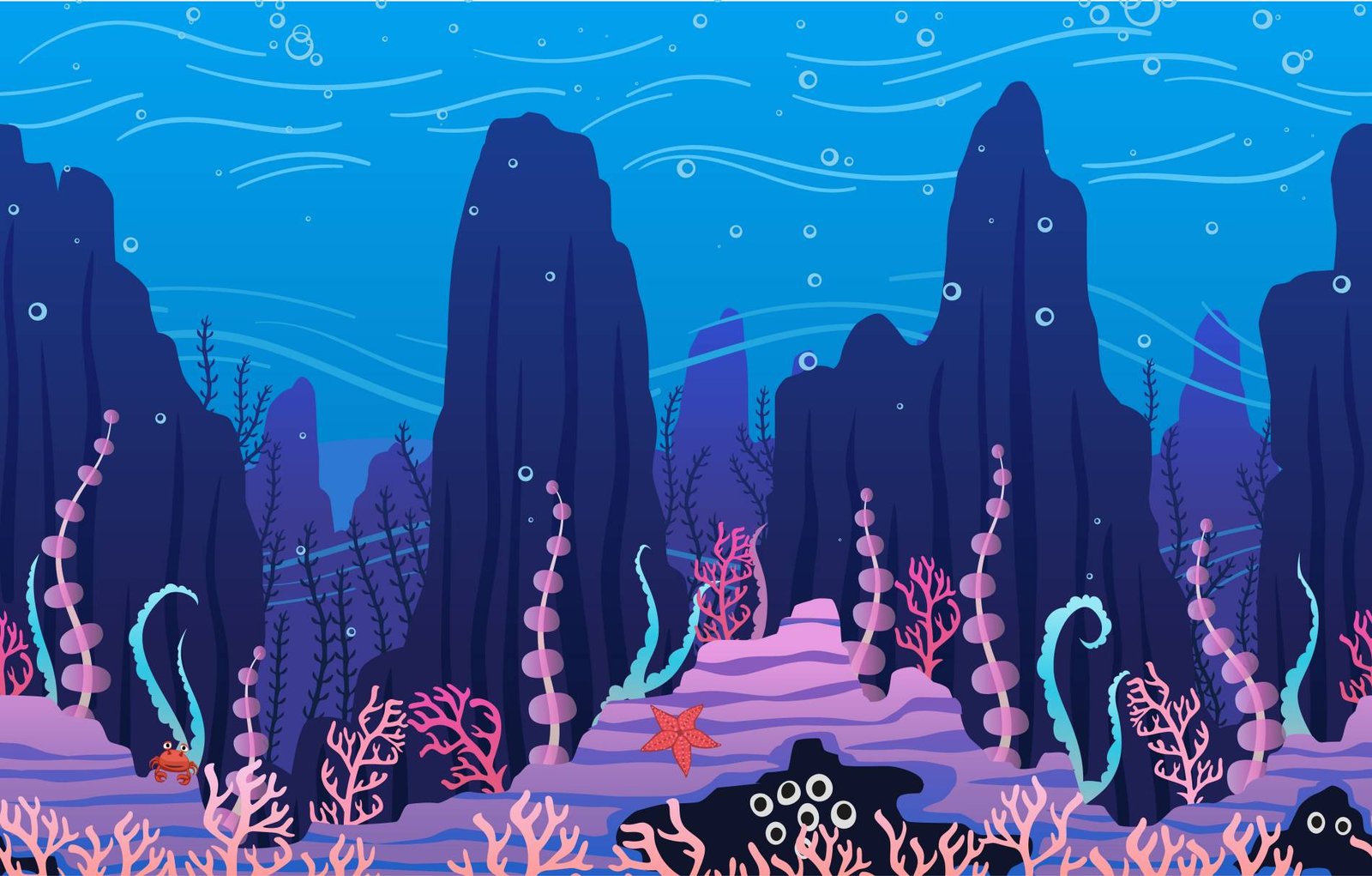 Ocean or sea underwater background. Empty sandy bottom with seaweeds grow at rocks and air bubbles floating at sunlight beam falling from above. Marine scene, undersea life Cartoon vector illustration
